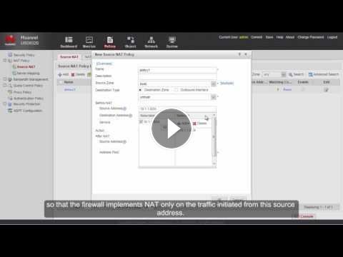 HUAWEI USG6000 series Source NAT configuration video explains Source NAT concepts, application scenarios, and troubleshooting processes and demonstrates how to configure Source NAT on the web UI.
